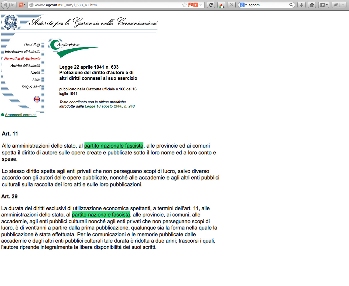Sarà per questo forse che sul sito dell’AGCOM ( in una sezione peraltro non più aggiornata dal 2009) la legge 633/1941  sul diritto d’autore, cardine dell’intero sistema del copyright italico, riporta tra i titolari del diritto d’autore anche il Partito Nazionale Fascista.